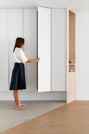 Home to a young couple who enjoys regular hosting and entertaining, Adina welcomes each guest with an open and uncluttered living and dining space, allowing the open kitchen to take centre stage. Adina's minimalist interior is characterised by simplicity, clean lines and wooden textures. A dash of soothing blue accompanies its monochromatic palette.